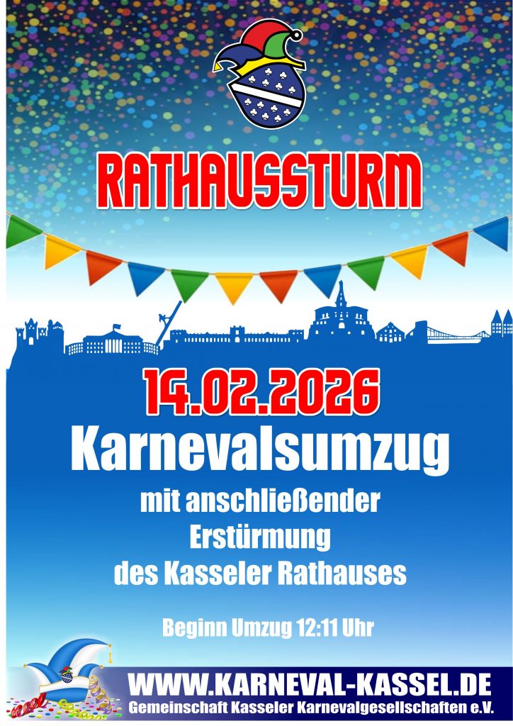 Am Karnevalssamstag, den 14. Februar 2026, formiert sich um 12:11 Uhr am Fridericianum der bunte Festzug der Gemeinschaft Kasseler Karnevalsgesellschaften. Mit Musik, Frohsinn und Kamelle ziehen wir gemeinsam Richtung Rathaus, um traditionell den Schlüssel der Stadt zu erobern! 🏰🔑