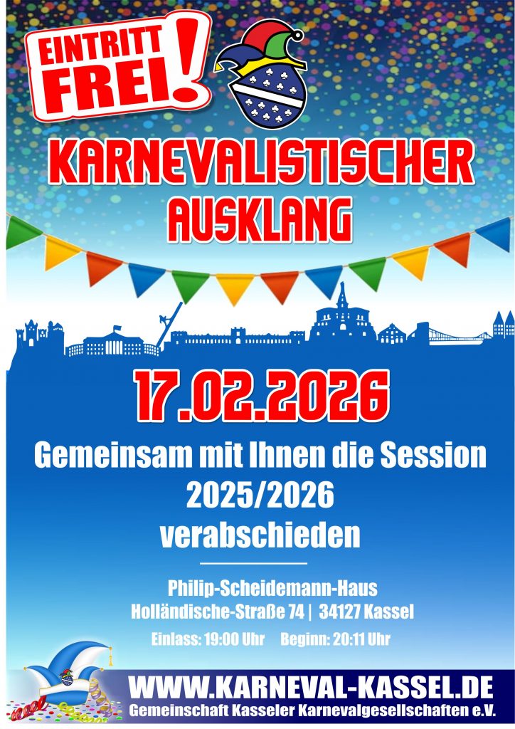 Mit einem ganz besonderen Programm beenden die Kasseler Karnevalvereine die Session. Am Dienstag, 17.2.26, laden sie bei freiem Eintritt ab 20.11 Uhr ins Philipp-Scheidemann-Haus. Dort gibt es ein buntes Programm und um null Uhr legen alle Närrinnen und Narren Orden und Kappen nieder. Der Aschermittwoch beginnt. Zuvor hielt aber Pfarrer Dirk Stoll noch seine Fastenpredigt, in der er gekonnt auf die Session und das Tagesgeschehen blickt. Sein Beitrag ist seit Jahren ein Höhepunkt im Kasseler Karneval. Tänze, Schaudarbietungen, Gesang und Büttenreden aller Vereine und Beiträge aus dem Landkreis Kassel runden das Programm ab. Präsident Lars Reiße: „Viele Programmpunkte wurden nur für diesen einen Abend eingeübt, außerdem zeigen wir noch einmal einige Höhepunkte der vergangenen Wochen.“