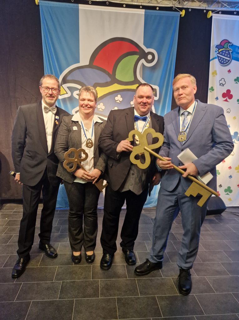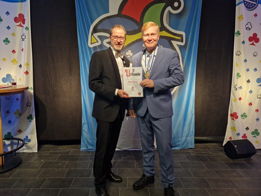 Das Präsidium der GKK verlieh den Orden in Ordnungsdezernent Heiko Lehmkuhl (CDU). GKK-Präsident Lars Reiße sagte in seiner Laudatio, in zwei Bereichen hätten die Karnevalisten Kontakt mit seinem Dezernat und das sei nicht Tiergesundheit und hoffentlich sehr selten Lebensmittelüberwachung. „Wir kennen Heiko aus der Zusammenarbeit im Bereich Sport, etwa in der Zusammenarbeit mit dem Sportamt und Hallenzeiten und Training und Veranstaltungen. Und wir haben Kontakt über das Ordnungsamt und mit der Stadtpolizei und Feuerwehr, wenn es um die Sicherheit der Volksfeste, besonders bei den Festumzügen geht“, so Reiße. Die mittlerweile notwendigen Sicherheitsmaßnahmen überstiegen oft die finanziellen Mittel und die ehrenamtlichen Kräfte. Lars Reiße: „Wir können sagen, dass die Stadt und Dezernent Heiko Lehmkuhl uns sehr beim Festzug unterstützen. Wir bedanken uns für die Zusammenarbeit und sehen die erst Stufe des Ordens auch als Motivation: Heiko, Silber und Gold sind möglich – wenn die Stadt auch weiterhin und vielleicht sogar noch ein wenig mehr die ehrenamtlich organisieren Volksfeste unterstützt.“