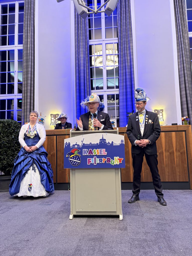 In der sprichwörtlichen 5. Jahreszeit eroberte traditionell in Kassel der Karneval auch das Rathaus: So fand am Sonntag im Sitzungssaal der Stadtverordneten die 43. Närrische Stadtverordnetensitzung statt – eine in Deutschland wohl einzigartige Veranstaltung und ein Höhepunkt jeder Karnevalssession. Stadtverordnetenvorsteherin Dr. Martina van den Hövel-Hanemann und Oberbürgermeister Dr. Sven Schoeller waren offiziell nur „Gäste“, denn es regierte Prinz Stefan II. Die Gäste erwartete ein abwechslungsreiches Programm mit Büttenreden von Fraktionsmitgliedern und dem Magistrat sowie Tanz- und Gesangsdarbietungen aus den Kasseler Karnevalgesellschaften. „Die Veranstaltung soll auch den Zusammenhalt der Kommunalpolitiker stärken“, betont Stadtverordnetenvorsteherin Dr. Martina van den Hövel-Hanemann. „Gemeinsames Lachen, humorvolle Distanz und Selbstironie fördern das demokratische Miteinander. Und in dieser närrischen Stadtverordnetenversammlung darf manches gesagt werden, was sonst vom Klingeln der Glocke unterbrochen würde.“