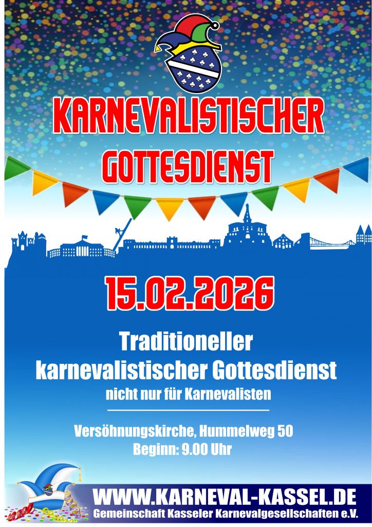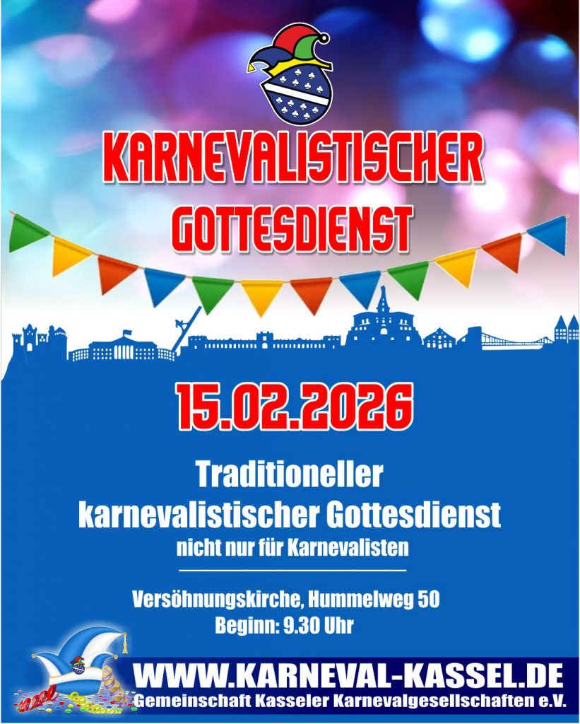 Zum traditionellen Gottesdienst am Faschingssonntag lädt die Gemeinschaft Kasseler Karnevalgesellschaften (GKK) ein. Der „Gottesdienst (nicht nur) für Karnevalisten“ findet am Sonntag, 15.2.26 um 9.30 Uhr in der Evangelischen Versöhnungskirche (Hummelweg 50) statt. Der GKK-Ehrensenator, Pfarrer Dirk Stoll, gestaltet die Liturgie. Pfarrerin Christina Allert hält die Predigt. Pfarrer Stoll pflegt seit Jahren die Tradition der närrischen Gottesdienste, der die Verbindung von Kirche und Karneval lebendig zeigen. Zu dem Gottesdienst kann man gerne in Kostümen erscheinen. Am Ende spendet er den Segen und wünscht den Närrinnen und Narren Gesundheit und Erfolg dabei, den Menschen bis Aschermittwoch frohe Stunden zu bereiten.