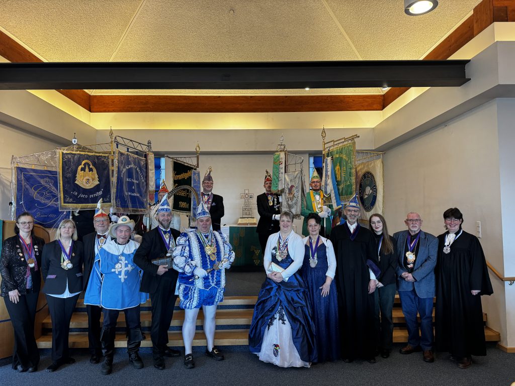 „Gottesdienst (nicht nur) für Karnevalisten“ in der Evangelischen Versöhnungskirche. Der GKK-Ehrensenator, Pfarrer Dirk Stoll, gestaltete die Liturgie. Pfarrerin Christina Allert hielt die Predigt. Pfarrer Stoll pflegt seit Jahren die Tradition der närrischen Gottesdienste, der die Verbindung von Kirche und Karneval lebendig zeigen. Am Ende spendete er den Segen und wünscht den Närrinnen und Narren Gesundheit und Erfolg dabei, den Menschen bis Aschermittwoch frohe Stunden zu bereiten.