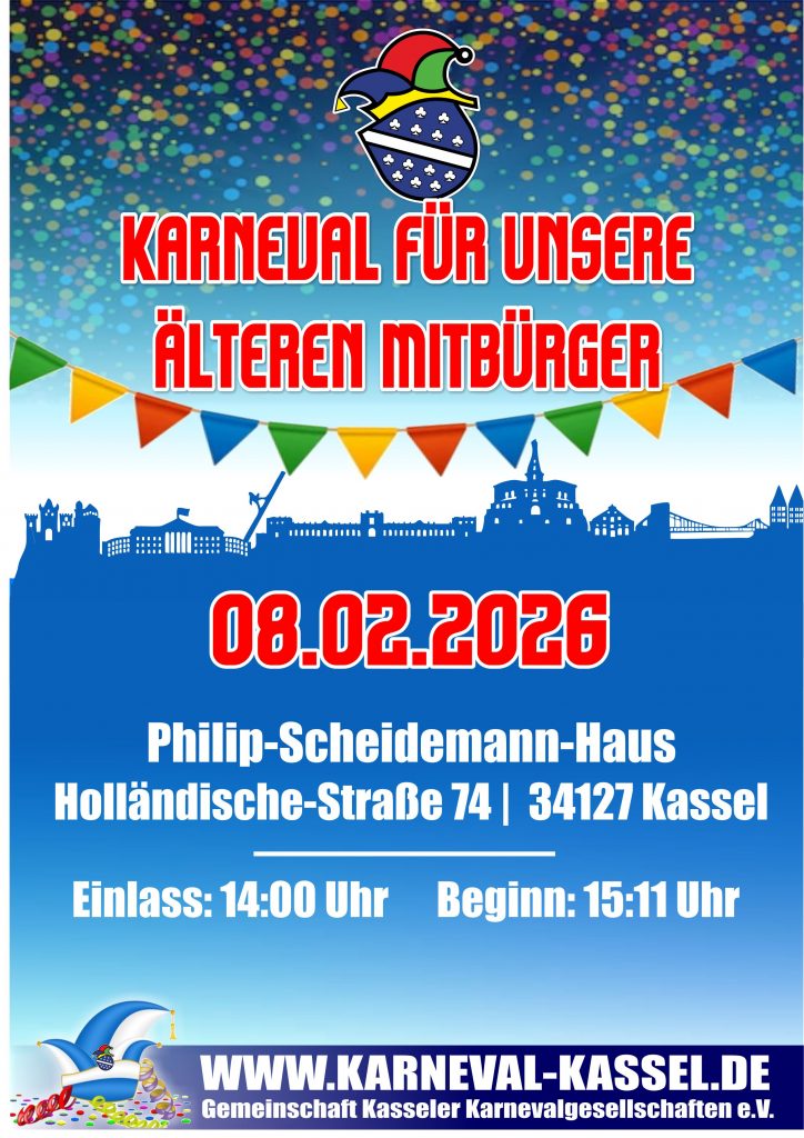 Die große Prunksitzung mit der Gemeinschaft der Kasseler Karnevalsgesellschaften für Seniorinnen und Senioren (GKK) findet am Sonntag, 8. Februar, um 15 Uhr im Philipp-Scheidemann-Haus, Holländische Straße 74, statt. Präsentiert durch das Prinzenpaar Prinz Stefan II. und Prinzessin Yvonne und geleitet durch den Elferrat präsentiert die GKK ein abwechslungsreiches Programm mit Garde- und Schautänzen, Büttenreden und Gesangsgruppen.